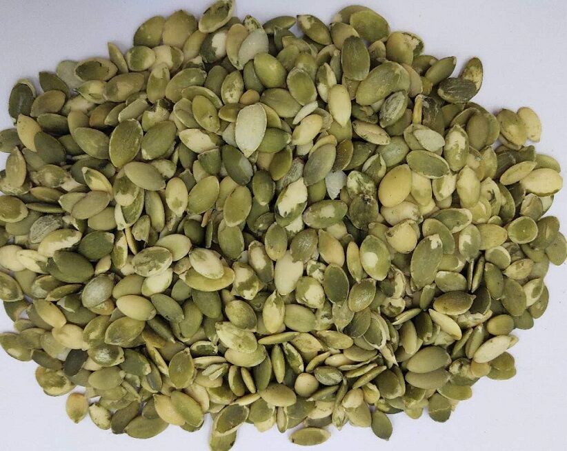 Raw pumpkin seeds soaked in water, and then baked until golden yellow, can be used to cook, recently also used in cakes, pasta class.